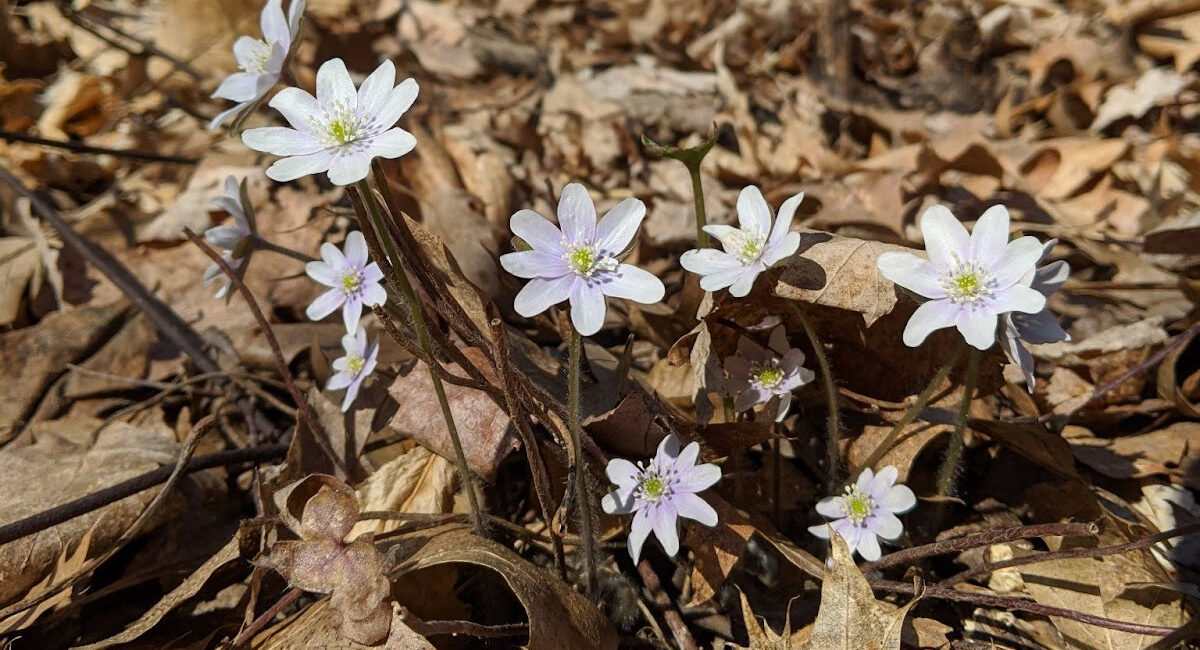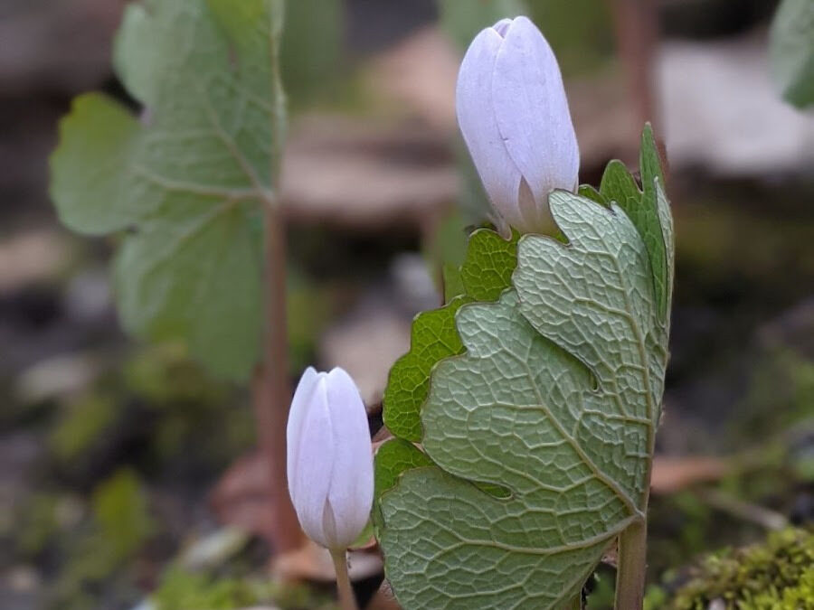 Sharp-lobed hepatica (Hepatica acutiloba) blooms bolting up through oak leaves. Courtesy of Becca Tucker.