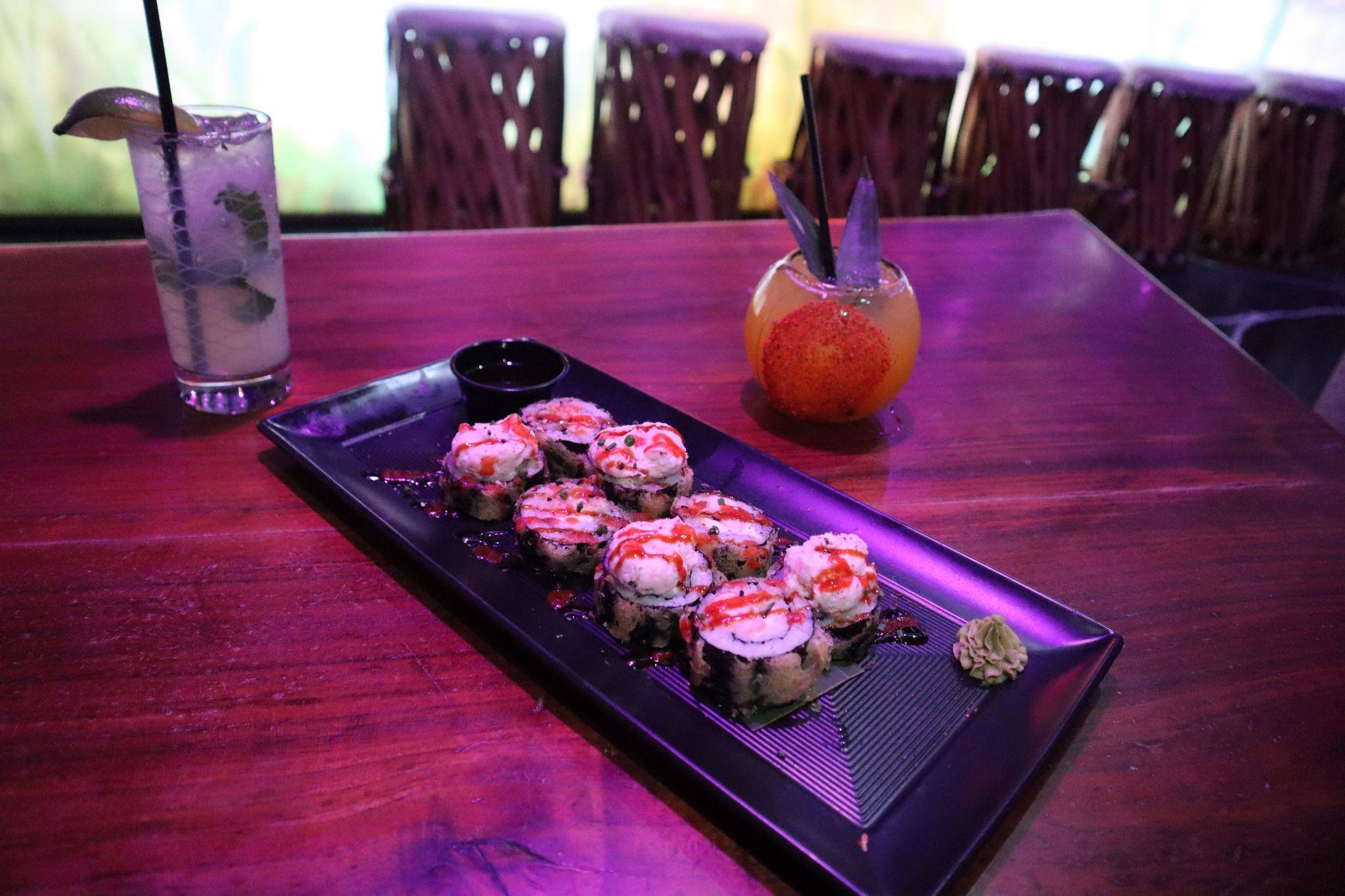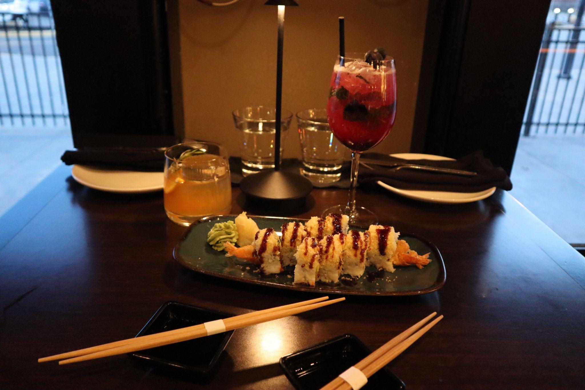 CRAVE’s blueberry lemonade cocktail ($6), honey old-fashioned ($7) and the crunchy roll ($8).