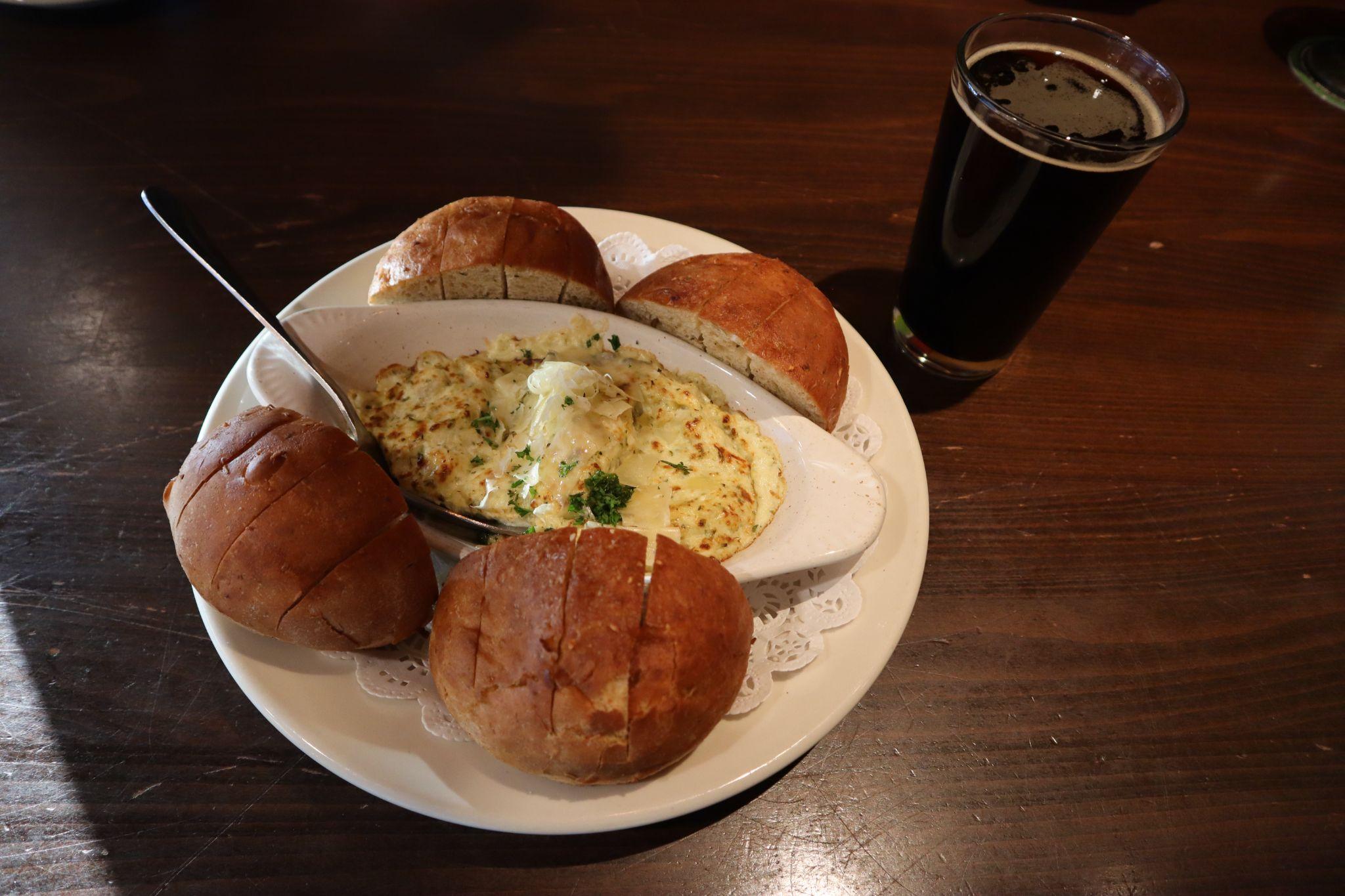 Pizza Lucé’s artichoke dip ($9), and Venn Brewing Co.’s Double Down Vanilla Double Brown beer ($5).