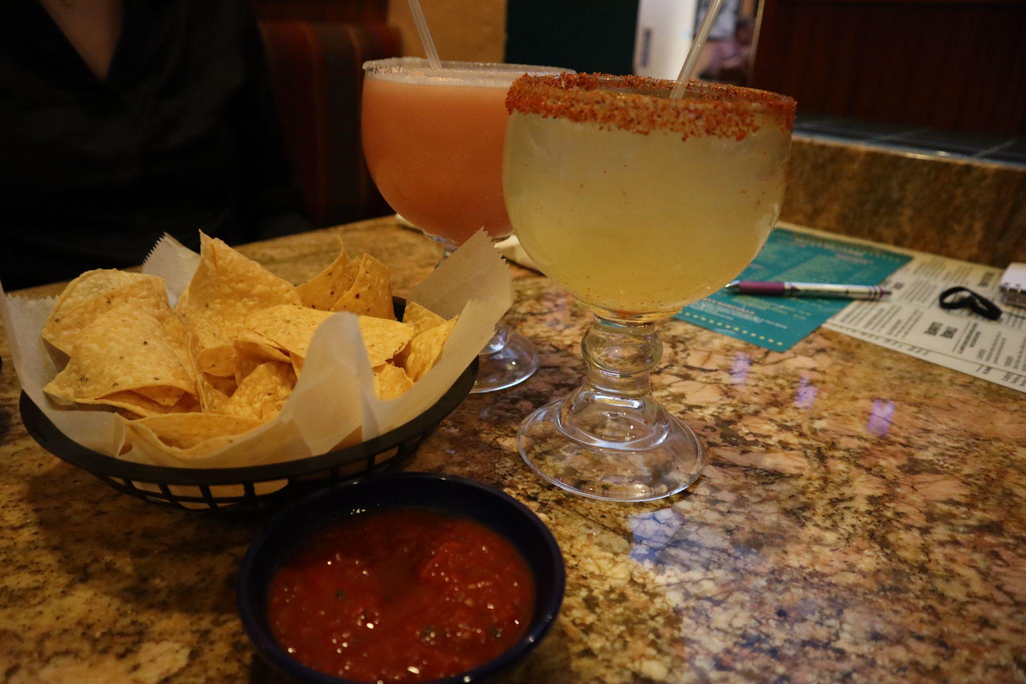 Shown above are the complementary chips and salsa, lime margarita on the rocks with Tajin ($5) and prickly pear blended margarita with sugar ($5).