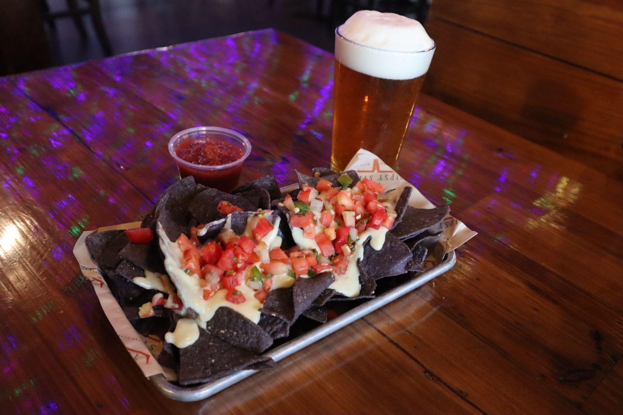 The Tipsy Steer’s Gouda nachos ($6) and the Honey Pines Amber Blonde ($5).
