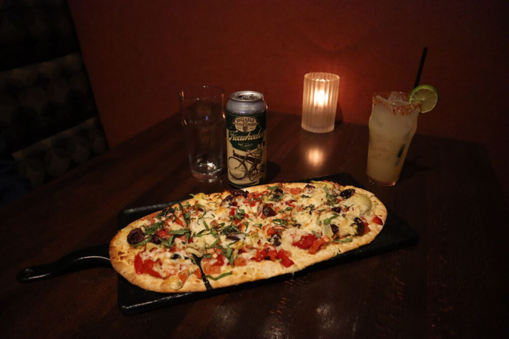The house margarita ($9), Sociable Cider Werks Freewheeler ($7) and Mediterranean flatbread ($14).