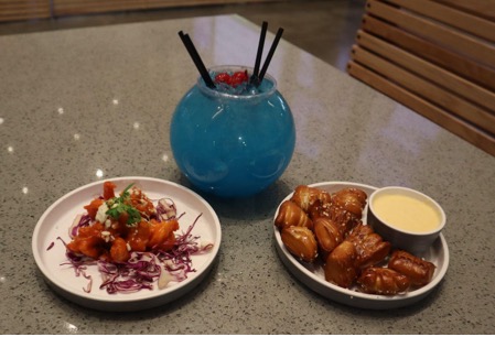 Shown above are the buffalo shrimp ($4), pretzel bites ($4) and Smashed by the Ocean Sociabowl ($19).