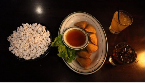 Luckys 13’s complimentary popcorn, deep-fried ranch ($9), whiskey sour ($4.50) and rum and coke ($4.50)