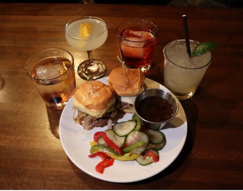 Axels’ Steakhouse Sliders ($8), old-fashioned ($13), gimlet ($11), negroni ($11) and house margarita ($8).