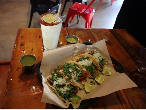 La Tapatia’s street tacos: carne asada, pollo, carnitas and al pastor ($12) and a margarita ($8).