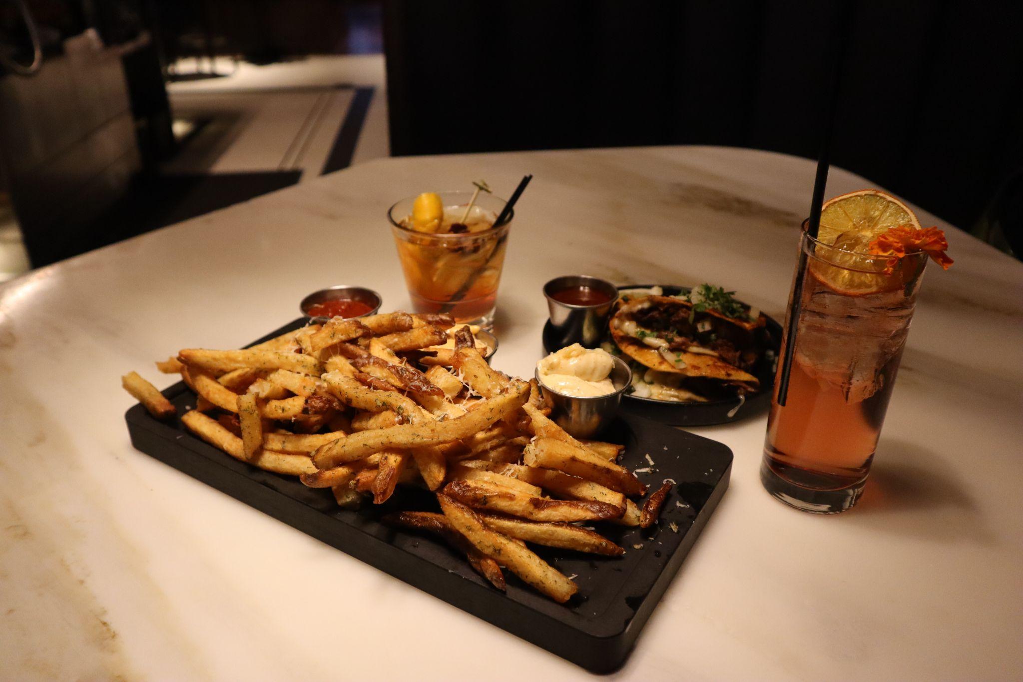 Baldamar’s Chandon Garden Spritz ($12), Benchmark Old Fashioned ($10), “A Big Dill” Fries ($10) and Short Rib Birria Tacos ($10).